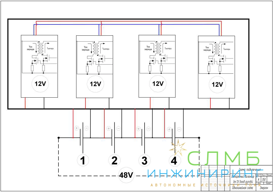 Аккумуляторный балансир M2-48/12V используется для группы батарей, соединенных последовательно. При работе группы аккумуляторных батарей подключенных последовательно, напряжение аккумуляторов может различаться между собой, из-за незначительной разницы в химическом составе батарей и температуры каждого элемента. Даже незначительная разница по напряжениям может привести к разбалансировке аккумуляторных батарей, работающих в одной группе. Разница напряжения будет увеличиваться при повторном цикле заряд/разряд. При этом часть батарей работающих в группе будет перезаряжаться, другая часть группы будет не дозаряжаться, что приведёт к преждевременному выходу из строя аккумуляторных батарей. Применение аккумуляторного балансира позволит обеспечить одинаковое значение напряжения на каждой из аккумуляторных батарей как в момент, когда батареи заряжаются, так и в момент разряда аккумуляторной группы.