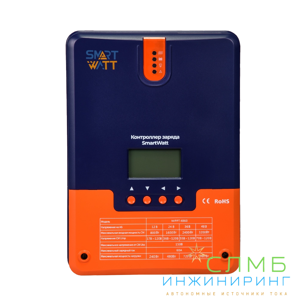 Контроллер заряда SMARTWATT MPPT применяет в солнечных энергосистемах и предназначен для управления процессами заряда и разряда аккумуляторных батарей. MPPT имеет наибольший КПД преобразования. Его работа основана на поиске точки максимальной мощности (Max Power Point Tracking) солнечных панелей, обеспечивая большую мощность заряда. Данный принцип работы влечёт повышение коэффициента использования энергии на 15-20% в сравнении с PWM-контроллерами. Для корректной работы МРРТ контроллеров необходимо, чтобы напряжение на солнечных панелях было выше напряжения на аккумуляторной сборке.