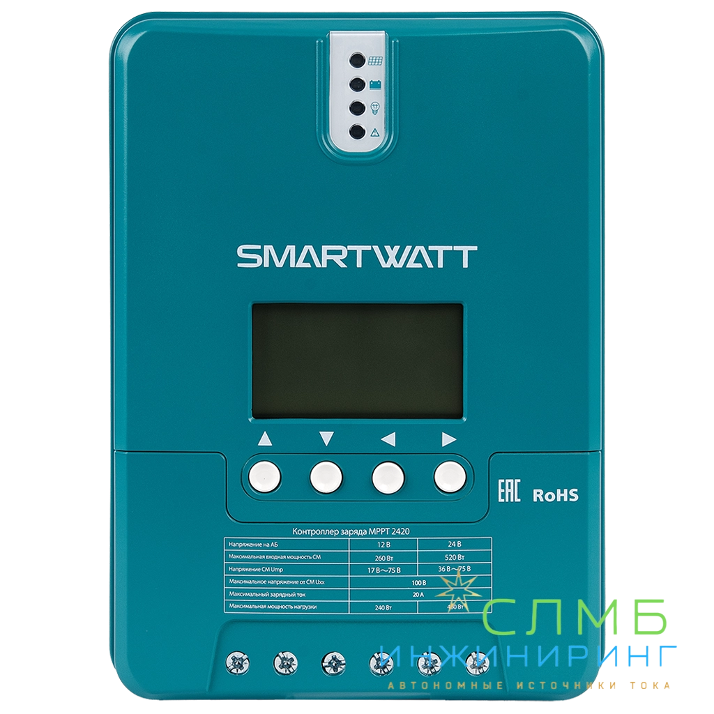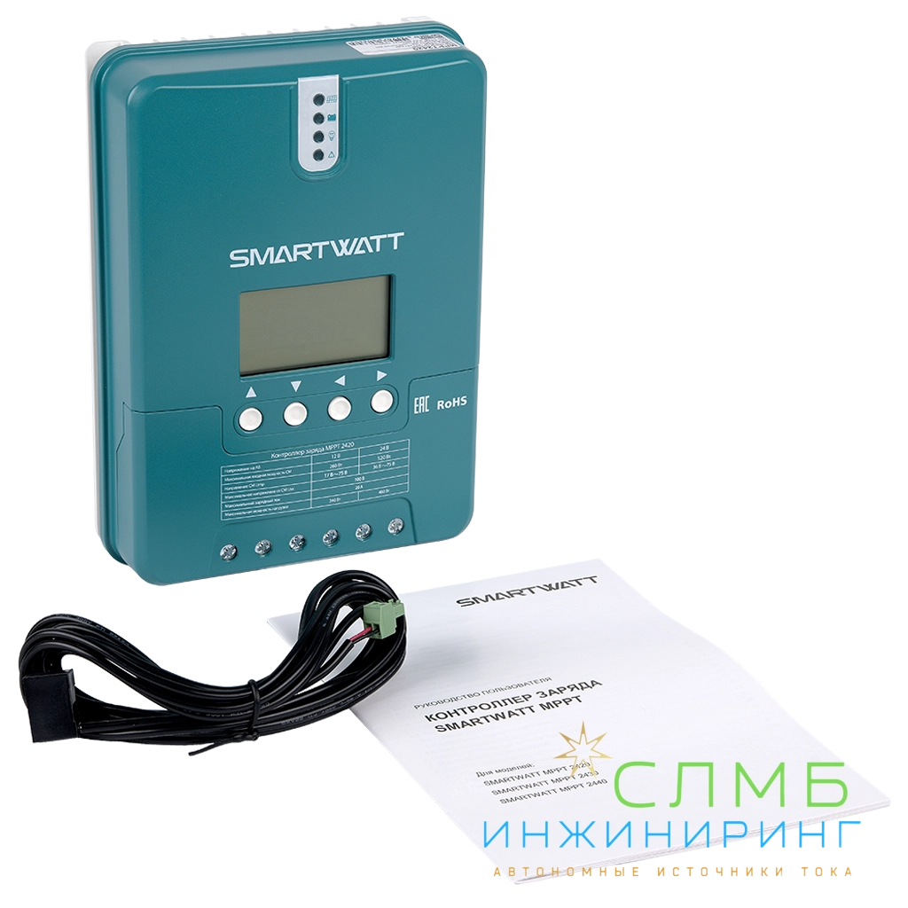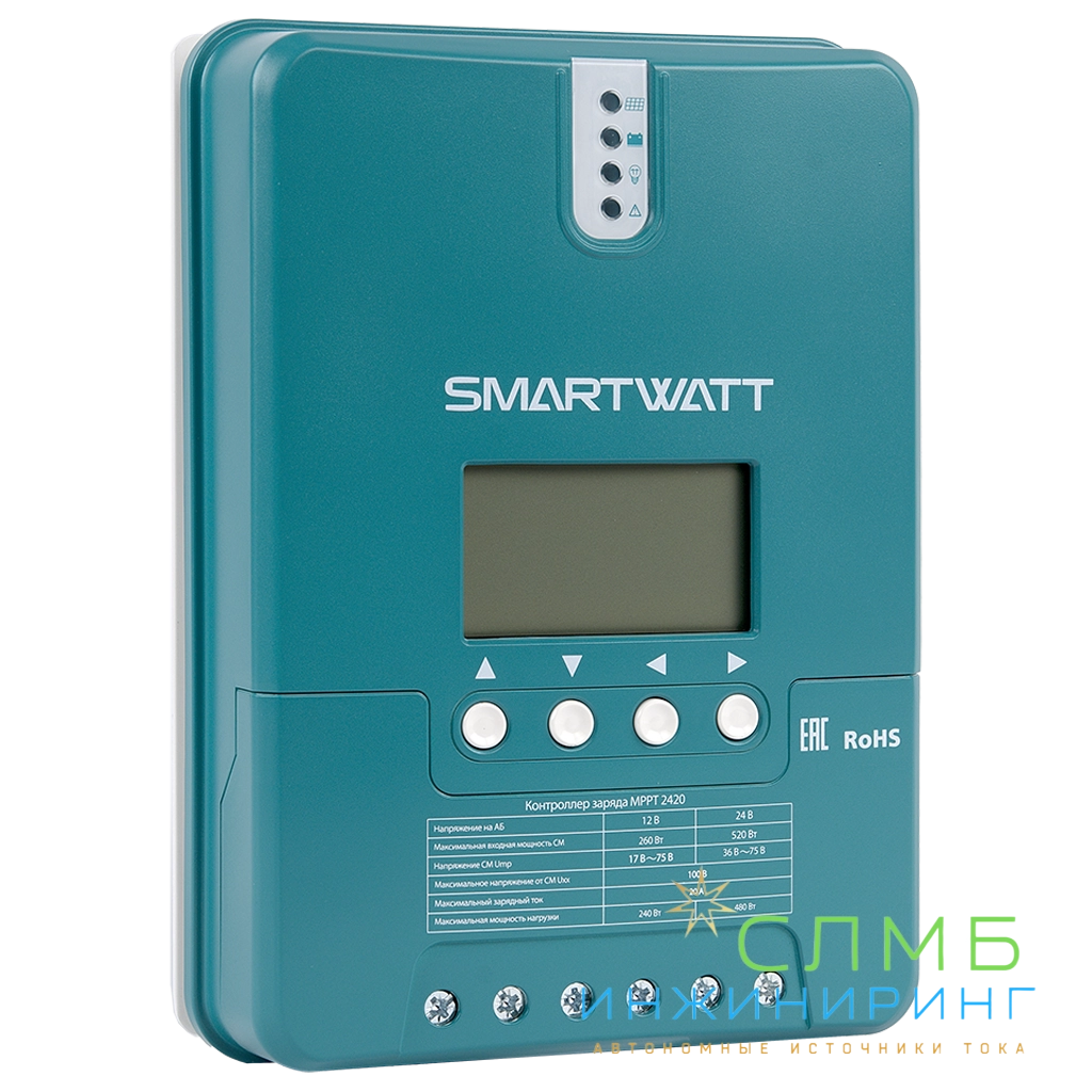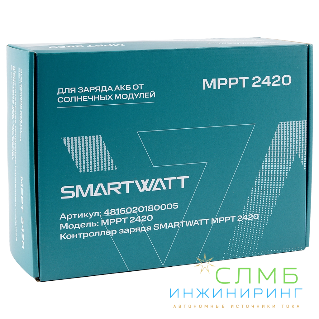Контроллер заряда SMARTWATT MPPT применяет в солнечных энергосистемах и предназначен для управления процессами заряда и разряда аккумуляторных батарей. MPPT имеет наибольший КПД преобразования. Его работа основана на поиске точки максимальной мощности (Max Power Point Tracking) солнечных панелей, обеспечивая большую мощность заряда. Данный принцип работы влечёт повышение коэффициента использования энергии на 15-20% в сравнении с PWM-контроллерами. Для корректной работы МРРТ контроллеров необходимо, чтобы напряжение на солнечных панелях было выше напряжения на аккумуляторной сборке.