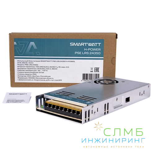 Импульсный блок питания SMARTWATT PSE LRS 24350 линейки H-POWER обеспечивает качественное электроснабжение потребителей, преобразуя напряжение сети переменного тока в стабилизированное напряжение постоянного тока. Предназначен для стабильного и надежного питания электронных компонентов внутри готовых изделий, роботов, медицинского оборудования, а также линий освещения и светодиодных лент, камер видеонаблюдения и охранных извещателей.