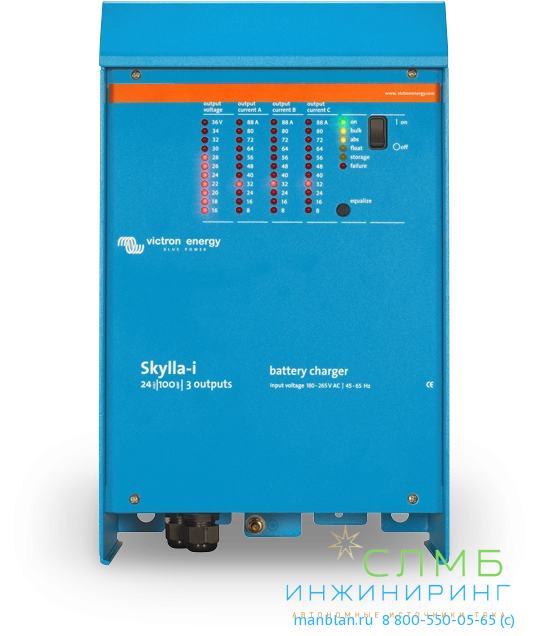 Victron Skylla-I 24/80 (3)Зарядное устройство для АКБ 24 В. Ток заряда 80 А. Адаптивная 7-и стадийная зарядная характеристика с температурной компенсацией. Три стадии заряда Li-Ion аккумуляторов. Три полных выхода для подключения АКБ. Размеры: 405х50х150 мм. Вес 8 кг.
