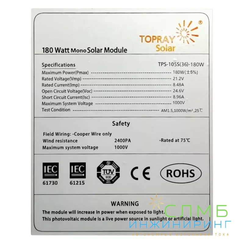 Солнечный модуль TPS105S(36)‑180W — это высокоэффективная фотоэлектрическая панель мощностью 180 Вт, предназначенная для преобразования солнечной энергии в электрическую. Подходит для автономных и сетевых солнечных электростанций, частных домов, дач, коммерческих объектов и удалённых установок.