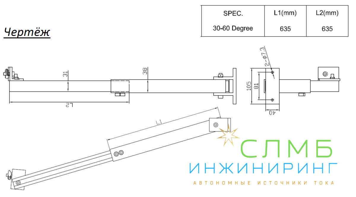 Задняя стойка для крепления монтажного профиля под углом к поверхности с диапазоном регулировки 30-60 градусов. Изготовлена из анодированного алюминиевого сплава Al 6005-T5.